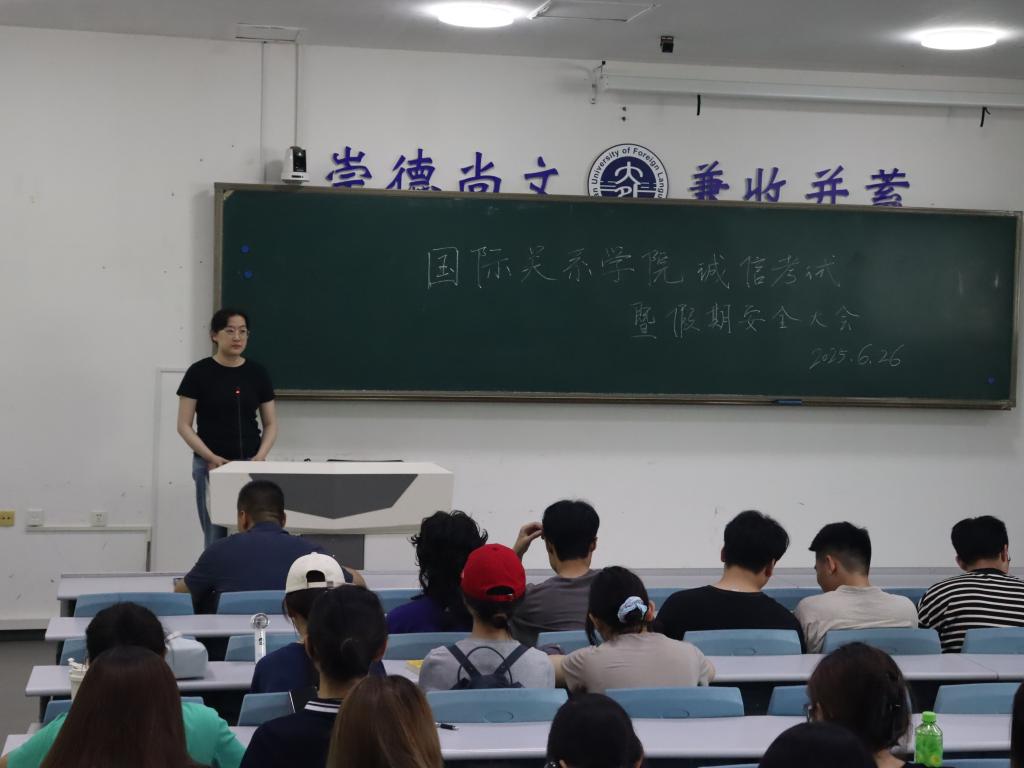 6月26日下午,国际关系学院于明德楼101教室举行诚信考试暨假期安全大会。国际关系学院全体学生参加本次会议,会议由辅导员侯培岩和毕如一主持。