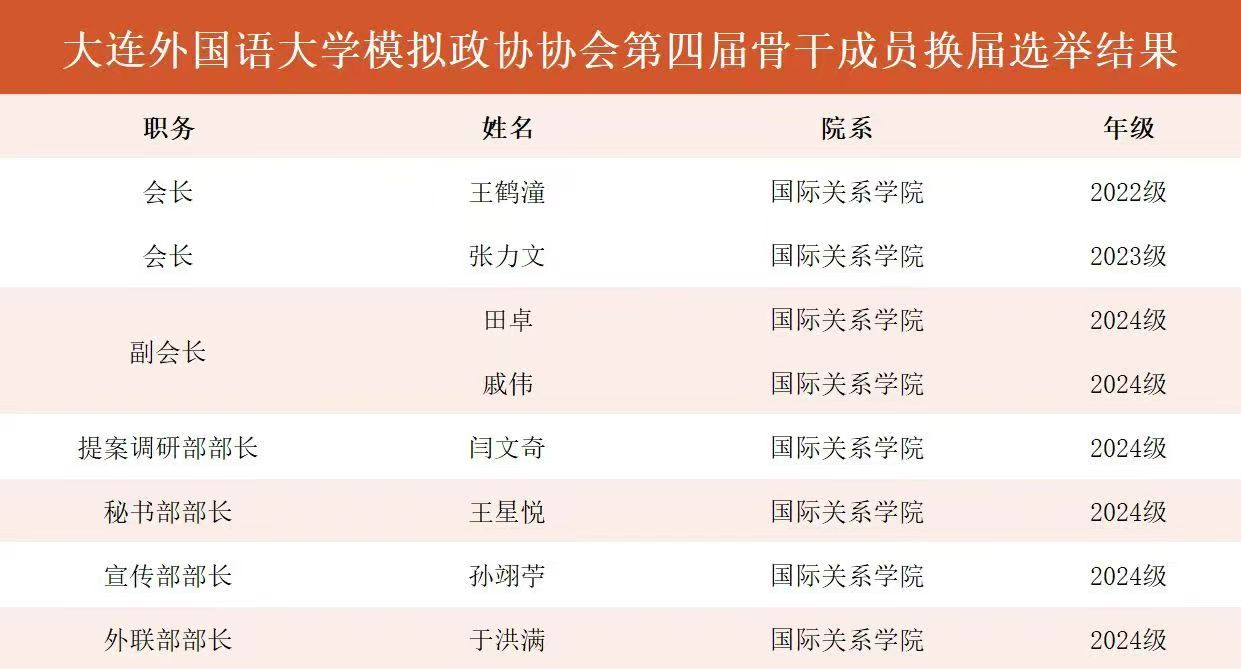 依据本次换届报名情况、竞选表现与过往一年以来工作表现,综合考虑选举以下同学为大连外国语大学模拟政协协会第四届骨干成员:
