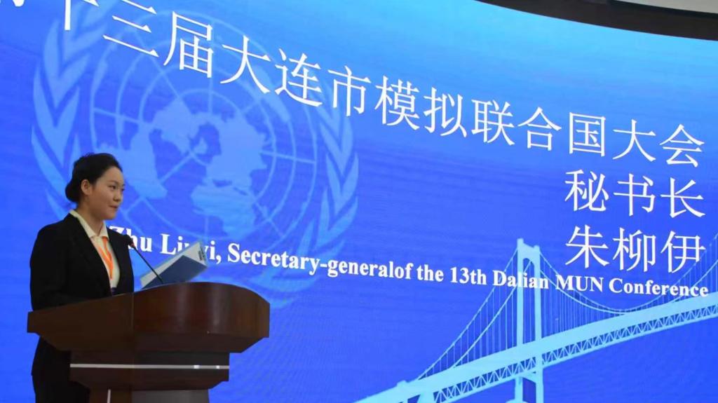 第十三届大连市模拟联合国大会秘书长朱柳伊同学回顾了模拟联合国活动引入中国三十年来的历程,介绍了本次大会的议题与范围。朱柳伊同学作为组委代表,衷心希望代表们在角色扮演中洞察国际关系逻辑,在观点交锋中提升跨文化理解力,在模拟实践中成长为时代所需的青年力量。