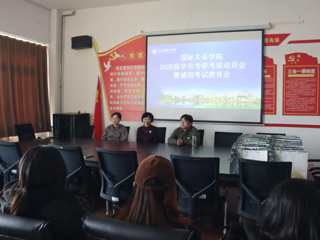 2025年12月18日下午,国际关系学院于励业楼537召开2026届考研考前动员会暨诚信考试教育会。党总支书记郝利群、副院长王琳、辅导员毕如一及2026届考研学生参加本次会议。本次会议由郝利群主持。