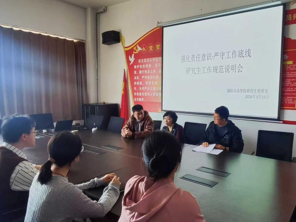 3月19日,国际关系学院研究生教研室召开“强化责任意识·严守工作底线——研究生工作规范说明会”,全面解读研究生培养各环节规范,部署本学期研究生工作重点,进一步统一思想、压实责任。